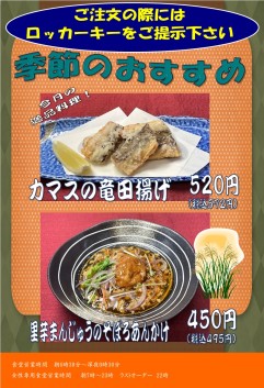 料金 | カマスの竜田揚げ 520円 里芋まんじゅうのそぼろあんかけ 450円 |