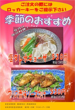 | 日本酒 | ・白鹿(小) 360円 ・白鹿(大) 670円 ・立山(小) 430円 ・立山(大) 790円 ・冷酒白鹿 生貯蔵 720円 ・冷酒若鶏「玄」 700円 |